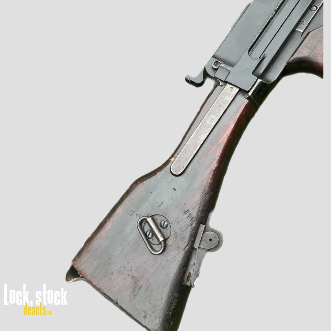 This deactivated Bren Mk I (1941-dated) retains all the classic features of the early-war pattern: the finely machined receiver, folding bipod, wooden buttstock, and pistol grip. The original finish shows honest service wear, giving it strong period character. The gun’s top-mounted magazine housing and quick-change barrel system remain intact, offering a complete and authentic look despite its deactivation.