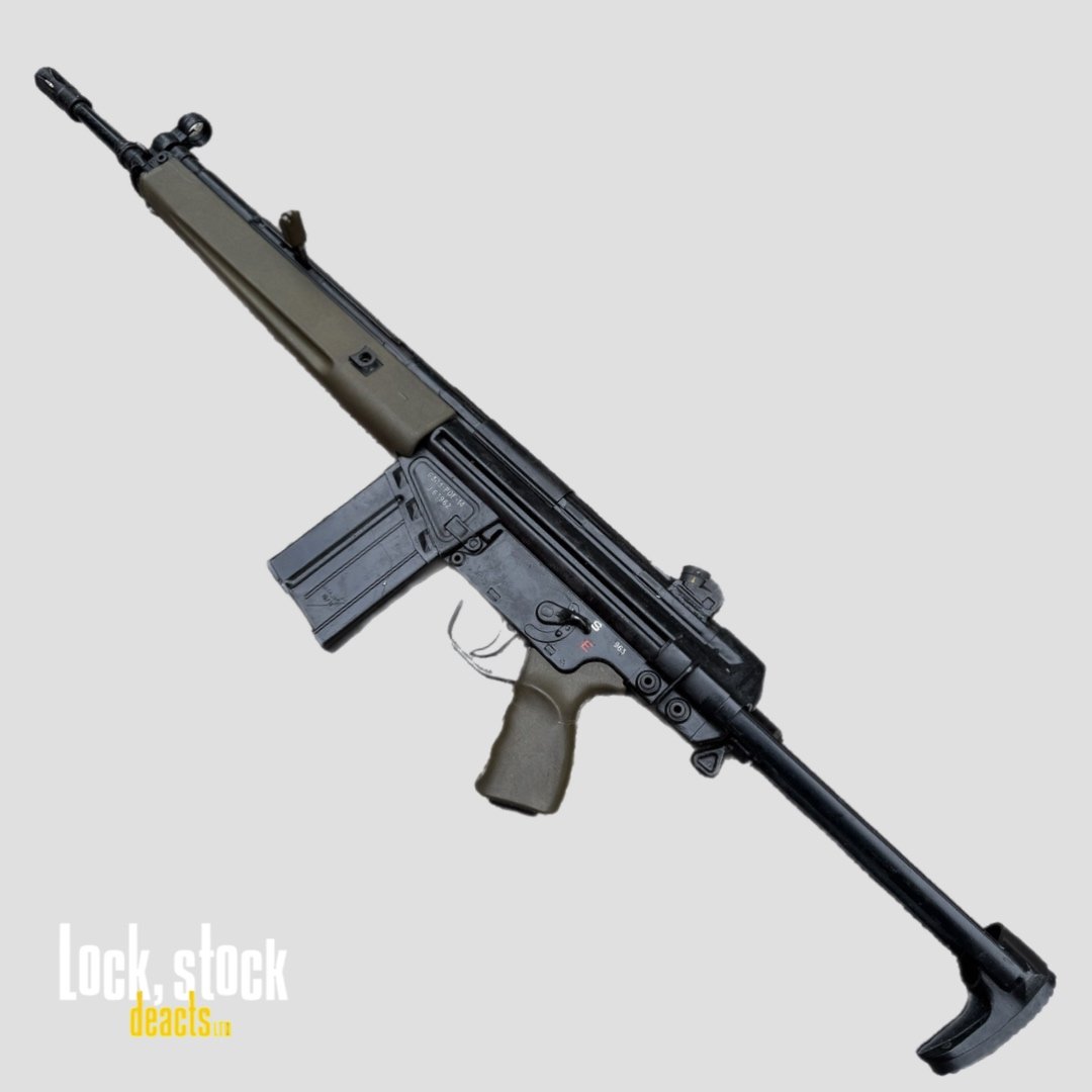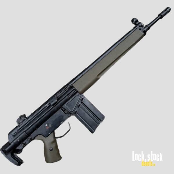 The G3A3 Rifle is a renowned, gas-operated, selective-fire battle rifle designed by Heckler & Koch (H&K) in the early 1950s. Widely recognised for its durability, accuracy, and power, the G3A3 was adopted by numerous military forces around the world, becoming a cornerstone of infantry weaponry during the Cold War era. Known for its simple, rugged design, this 7.62mm NATO calibre rifle remains a favourite among military enthusiasts and collectors today.