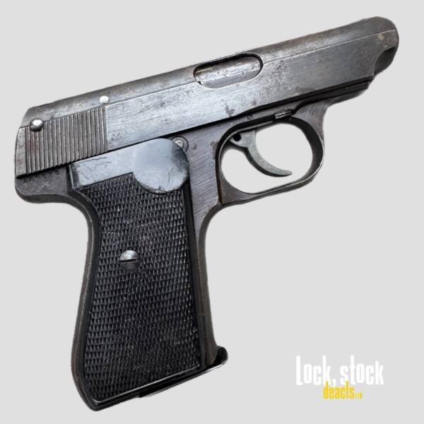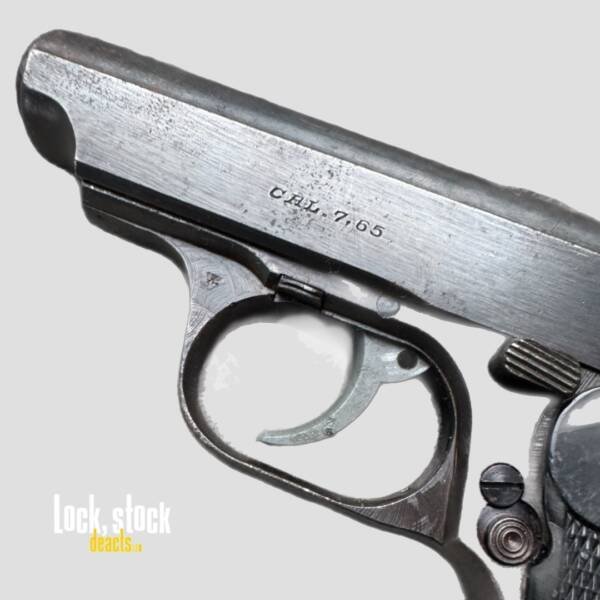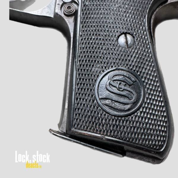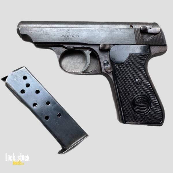The **Sauer 38H** is a **German semi-automatic pistol** introduced in **1938**. Chambered in **7.65mm (.32 ACP)**, it was designed by the German company **J.P. Sauer & Sohn** and was used by both the **Wehrmacht** and **German police** during **World War II**. Known for its **ergonomic design**, the Sauer 38H featured a **double-action trigger** and a **simple blowback operation**. It was compact, making it suitable for concealed carry by officers, and had a **magazine capacity of 8 rounds**. Although it was reliable, it was often overshadowed by other sidearms in the German arsenal, like the **P38**. The Sauer 38H remains a popular collector’s piece today due to its distinctive design and historical significance.