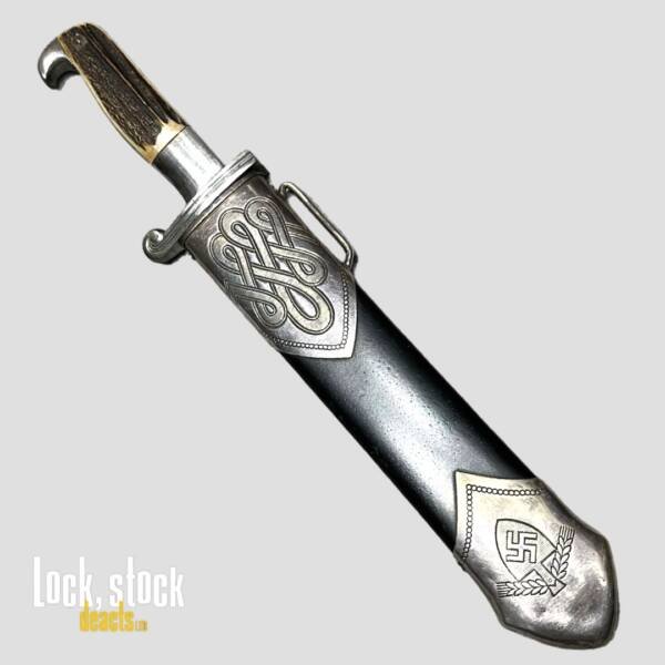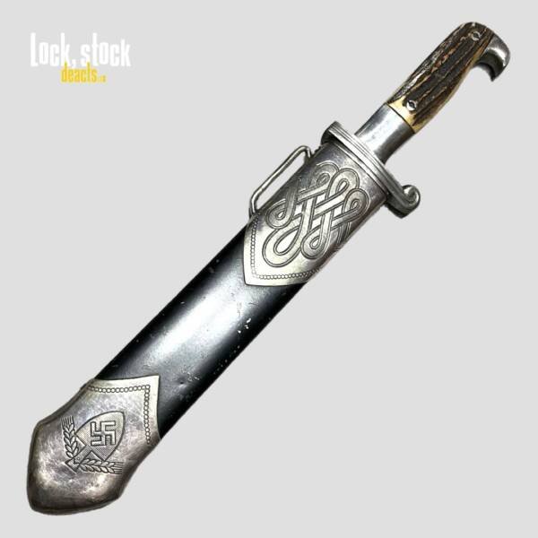This is an original example of the Third Reich RAD Man’s Dagger, manufactured in Solingen and marked “Ges. Gesch.” on the reverse. Issued to members of the Reichsarbeitsdienst (RAD) — the German Labour Service — these daggers formed part of the official dress of the organisation from the mid-1930s until the end of the Second World War.