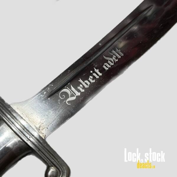 The dagger is fitted with a broad, polished steel blade, etched with the RAD motto “Arbeit adelt” (“Work ennobles”). The reverse bears the Ges. Gesch. Solingen maker’s mark, signifying Solingen’s role as the centre of edged-weapon production during the period.